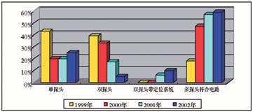 圖1 所示從1999年到2002年(2002年的數(shù)據(jù)是由上半年數(shù)據(jù)推算而來)單探頭、雙探頭、雙探頭帶定位系統(tǒng)和多探頭符合線路,四種不同核醫(yī)學設備每年各種類型所占比例。可以看出。最為明顯的是普通雙探頭在2002年僅僅占總數(shù)的5%,普通單探頭占總數(shù)25%,多探頭帶符合電路系統(tǒng)占總數(shù)59%。普通雙探頭帶X線定位系統(tǒng)占總數(shù)10%。可以看出單探頭SPECT和多探頭符合電路系統(tǒng)呈增長趨勢,尤其以多探頭符合電路系統(tǒng)更為明顯。