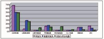 圖2 從2001年7月-2002年6月調研10家單探頭用戶、5家普通雙探頭用戶和30家雙探頭可變角度帶有符合電路用戶臨床檢查類型的數(shù)據(jù)。為了便于比較,采用相對數(shù)的方法。可以看出對于單探頭用戶在臨床主要用于骨掃描和甲狀腺檢查。對于雙探頭帶有符合電路系統(tǒng)的用戶,骨掃描46%、心肌血流灌注23%、符合電路10%、甲狀腺9%、心肌代謝7%、GA-67為2%,其它(腎臟、肝等)3%。可以看出雙探頭符合電路系統(tǒng)最大的貢獻是為臨床開拓出20%新的檢查項目,最為重要的是這些檢查項目將成為主流臨床檢查。這可能是雙探頭(多探頭)符合電路在國內(nèi)急劇增加的主要原因。